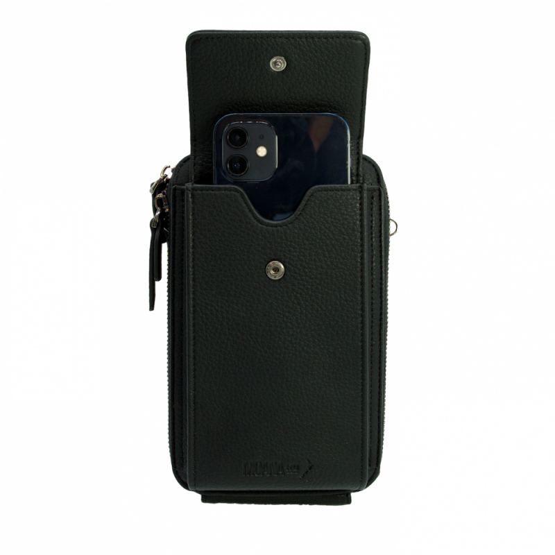 Phone holder at the front and the zipped rear opens to reveal an efficient inner for the essentials.