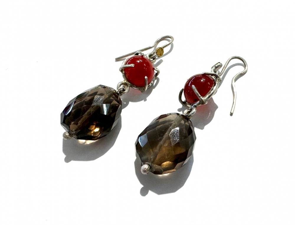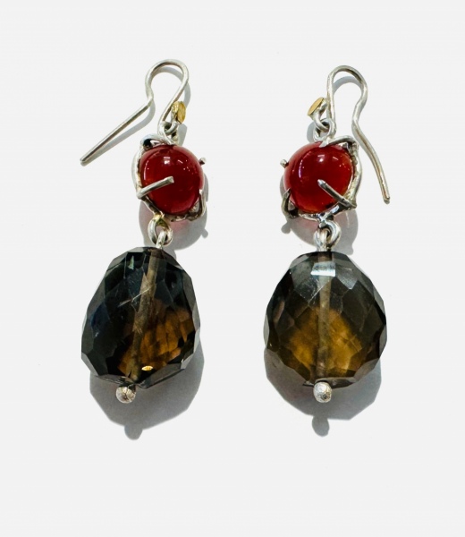These earings are handcrafted in sterling silver and 24ct gold, they feature a Carnelian Stone and Smokey Quartz drops