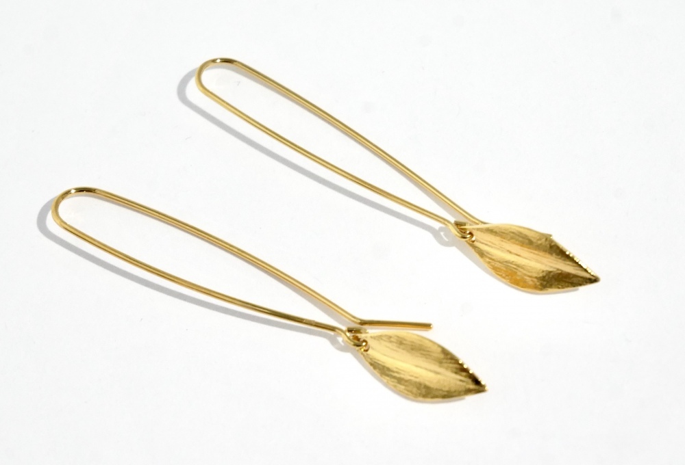 A single handcrafted leaf hangs from a gold stem, textural detailing is hand carved with care, causing light to gently play off the earring’s surface.