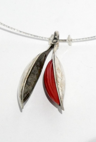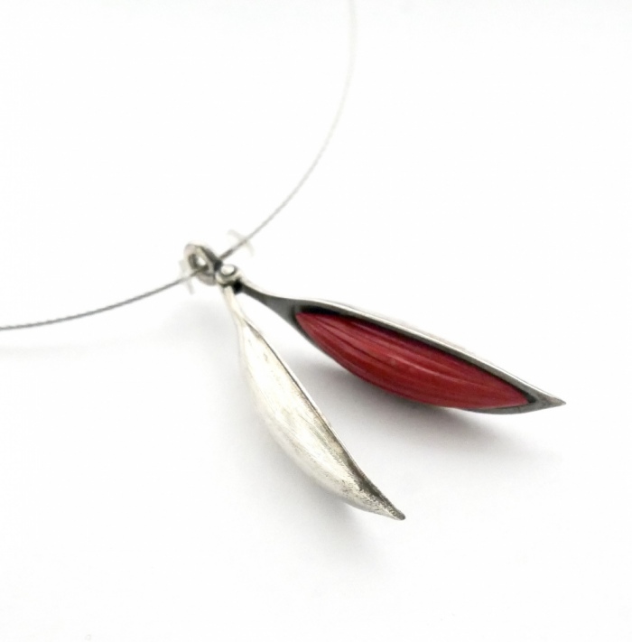 Handcrafted sterling silver creates a long elegant pod shell, hinged to open and revealing a wooden carved berry, can be worn open or closed.