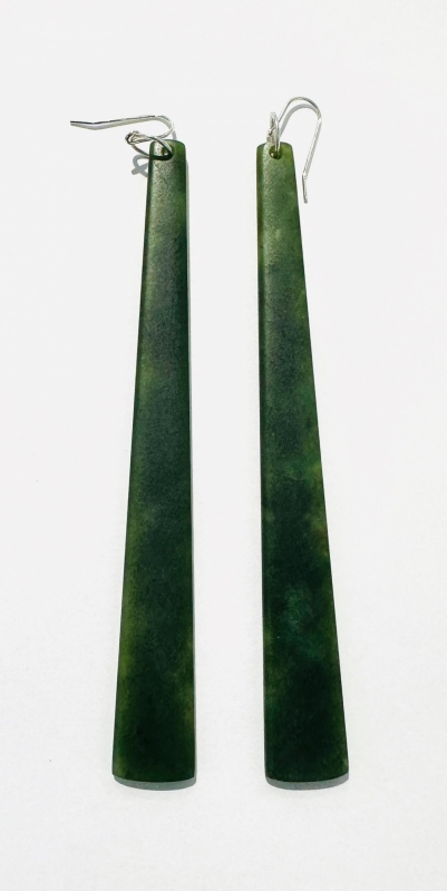 Discover the exquisite beauty of New Zealand Pounamu with our long, elegant earrings handcrafted by the talented Darren Stowe. These captivating green stone earrings are a tribute to the natural wonder of Aotearoa's prized Pounamu, also known as New Zealand jade or greenstone.