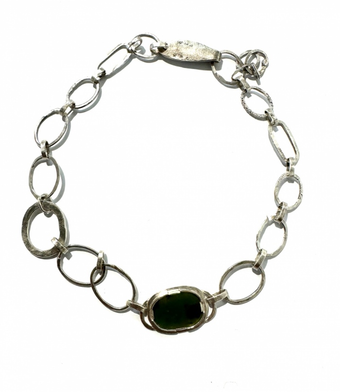 This NZ Pounamu necklace is made from sterling silver handcrafted links. It features a piece of Pounamu encased in silver, an elegant piece of jewellery.