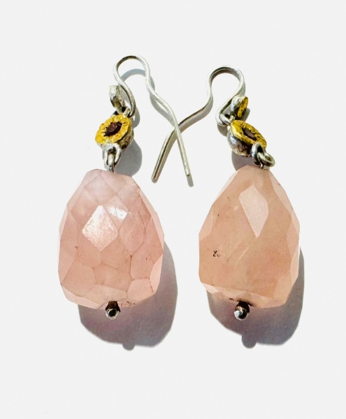 These earings are handcrafted in sterling silver and 24ct gold, they feature a pink Spinel & a Rose Quartz