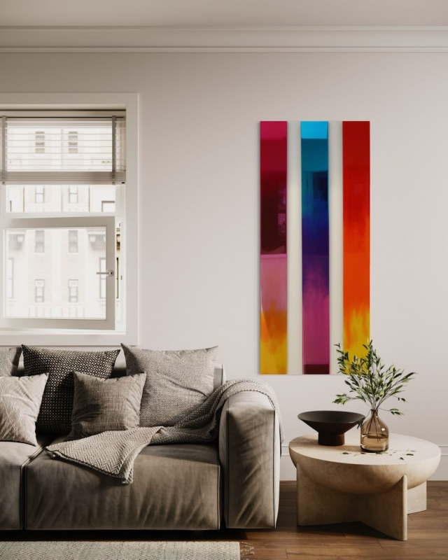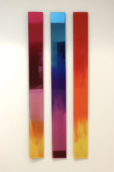 Vibrant Solitude reflects moments of quiet connection with the rising sun—where emotion and light meet. Through vibrant, fluid colour on mirrored glass, I explore the coexistence of stillness and movement. Guided by both intention and spontaneity, each work seeks to evoke feeling rather than depict form. These paintings invite you to pause, reflect, and experience the warmth and freedom found in shifting light.