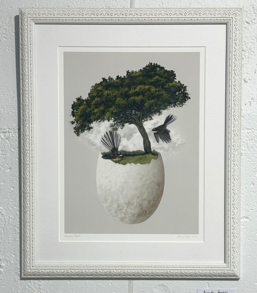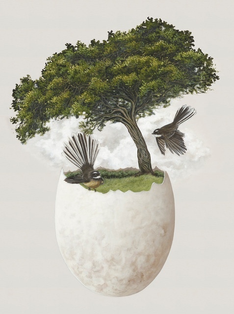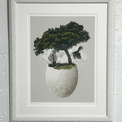 Friendly Fantail tells a story of resilience and renewal, with a windswept tree rooted inside a delicate egg, symbolizing the balance of strength and vulnerability. Known for their playful energy, these curious little birds evoke thoughts of connection and discovery.