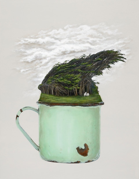 Storm captures a whirlwind of windswept trees from Slope Point, all contained in a humble enamel teacup. It’s a playful reminder of camping trips, cooking on the ‘billy,’ and living a little rough—where a storm in a teacup still meant good times and great memories with family."