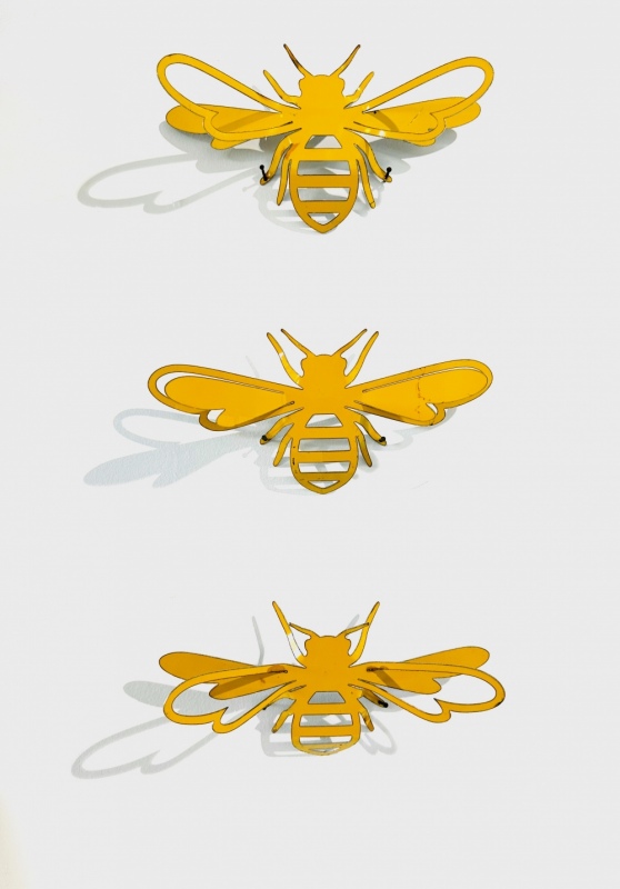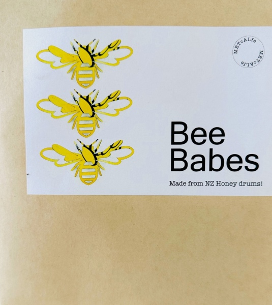 These Bee Babes are looking for a new hive... Three Bee Babes to a set 22x11cm each They are made from repurposed 44 gallon NZ Honey drums. They are flat packed in an A4 envelope and pins are provided to fix them to a wall